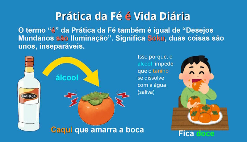 Portanto, em todos os princípio budista que tem termo "é" ou "são", ou seja "verbo ser" na tradução em português, tais como prática da fé é vida diária, budismo é sociedade, desejos mundanos são iluminação, os sofrimentos do nascimento e da morte são nirvana, etc... Tem que enteder que não é ou são mesma coisa.